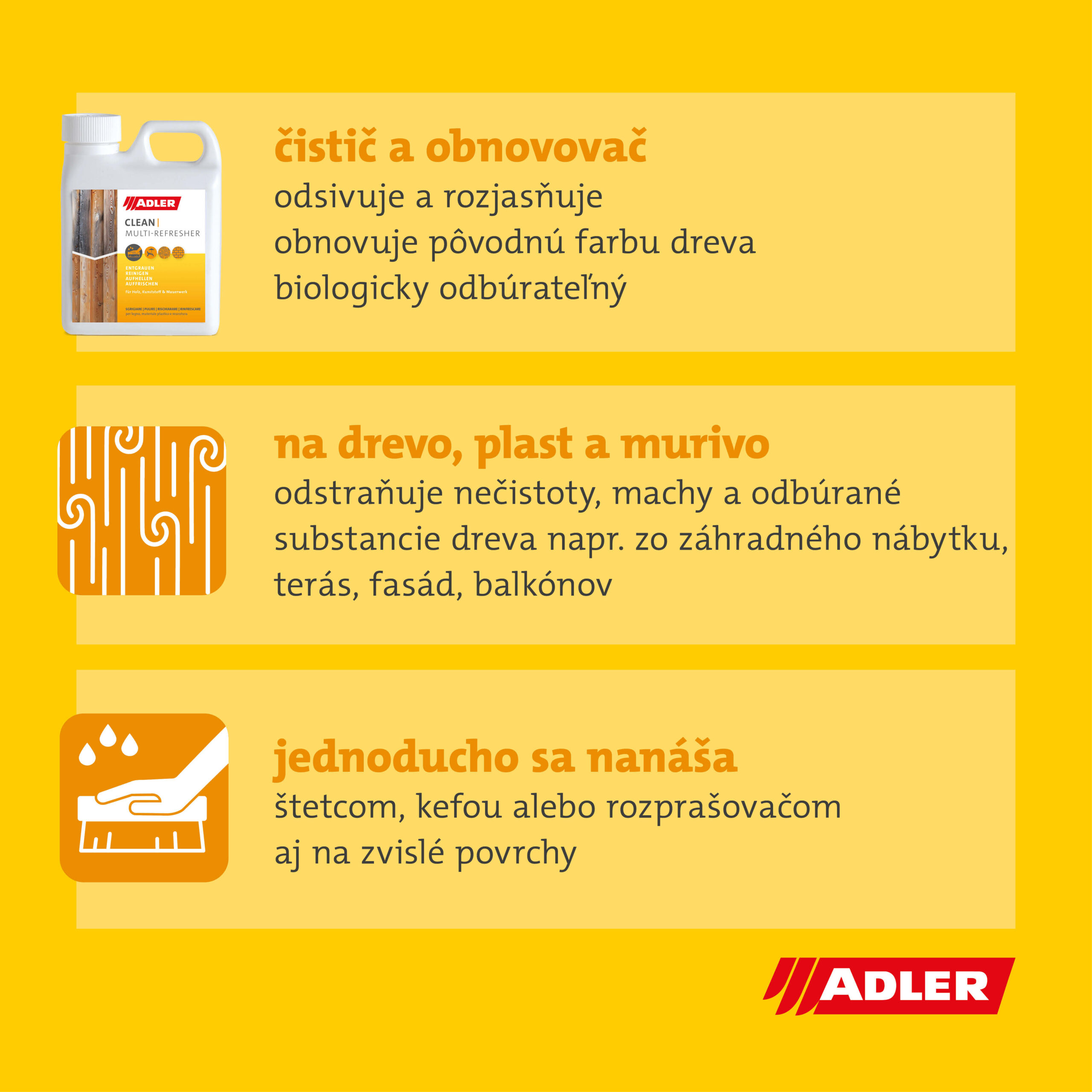 Efektívny čistič, obnovovač a odsivovač na zvetrané a zosivené drevo, plasty, kameň a murivo na báze kyseliny šťaveľovej pre domácich majstrov a remeselné použitie. Je biologicky odbúrateľný. Produkt je náhradou za ADLER Holzentgrauer. Výdatnosť: cca 5-20 m2/L.
