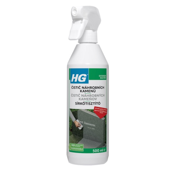 Náhrobné kamene sú vyrobené z rôznych materiálov, ale najčastejší je stále prírodný kameň. HG čistič náhrobných kameňov je čistiaci prostriedok vhodný na pomníky zo žuly, mramoru, vápenca a iných druhov prírodného kameňa. 0,5 litra vystačí približne na 3 m².