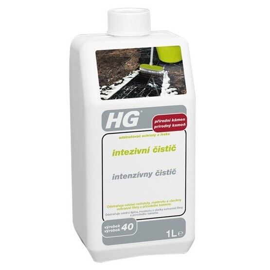 Objem: 1L. HG intenzívny čistič (odstraňovač ochrany a lesku) (HG výrobok 40) je špeciálne vyvinutý na jednoduché a rýchle odstraňovanie mastnoty a zatvrdnutej nečistoty na mramore a iných druhoch vápencového prírodného kameňa, ako je travertín, solnhofenský vápenec, žula, terrazzo a pod. Je vhodný aj na odstraňovanie leštidiel a iných ochranných filmov, ako je HG ochranný film s leskom (ochrana a lesk) (HG výrobok 33).. Rozpustite pol litra produktu v polovici vedra (5 l) vlažnej vody a naneste ho na celú plochu pomocou handry alebo mopu. Nechajte pôsobiť niekoľko minút. Následne odstráňte roztok z podlahy pomocou handry. Podlahu dôkladne umyte čistou vodou.