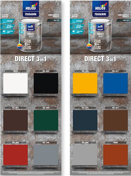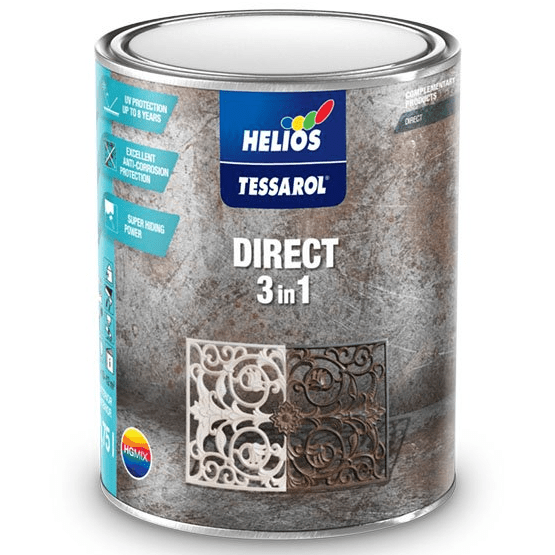 TESSAROL DIRECT 3in1 je antikorózny jednošichtový náter určený na dekoráciu a ochranu železných a oceľových povrchov. Môže sa nanášať priamo na suchý a zbrúsený povrch, ktorý ste predtým očistili od hrubých čiastočiek hrdze. Vďaka jeho vynikajúcim antikoróznym vlastnostiam ho môžete nanášať priamo na povrch bez predchádzajúceho nanesenia základného náteru. Na natretom povrchu vytvára lesklú vrchnú vrstvu, ktorá povrch zároveň chráni pred koróziou.